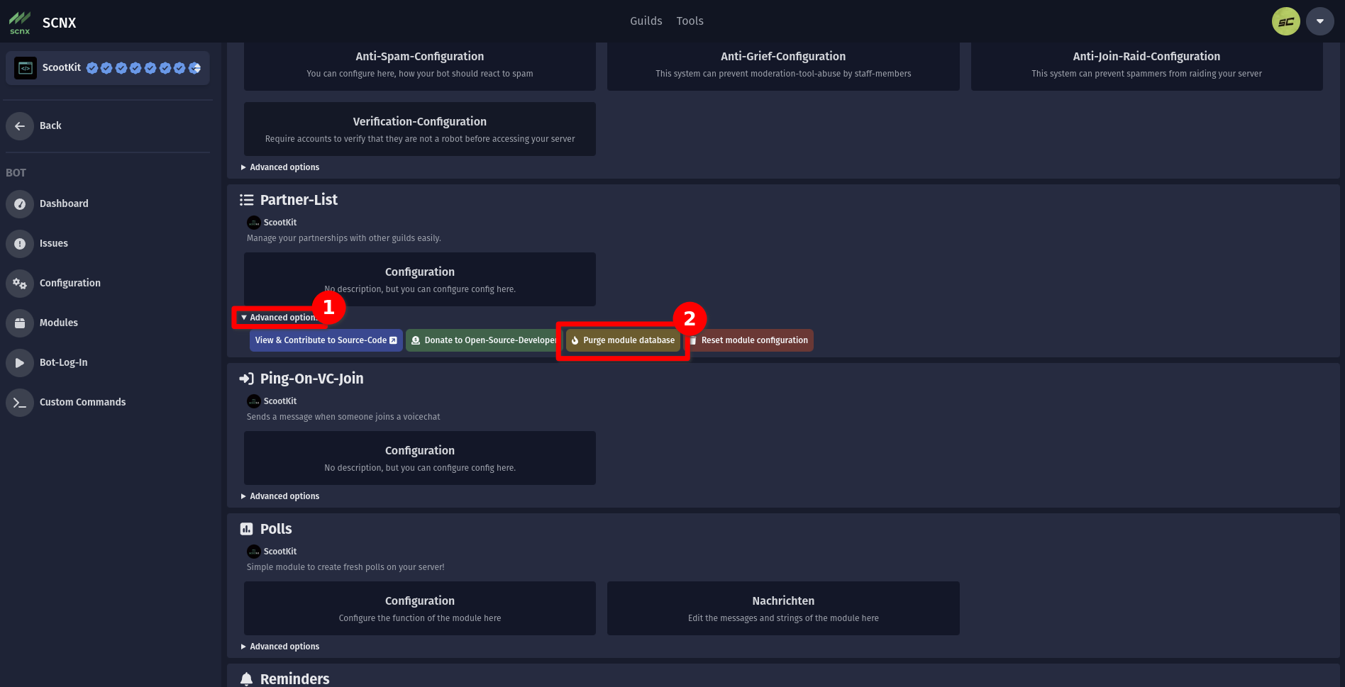 Das Löschen der Datenbank eines Moduls löscht automatisch alle vom Modul gespeicherten Daten.