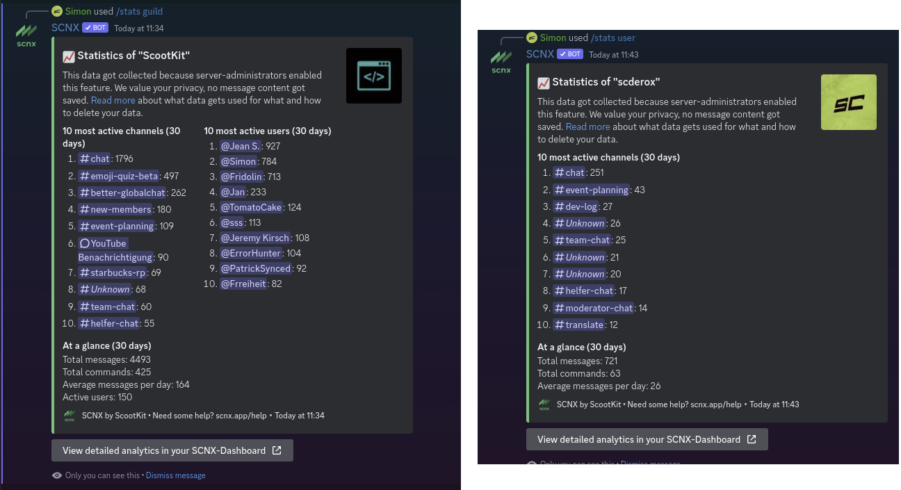 /stats guild: Shows a statistics overview of your server. This includes the 10 most active channels and users in the last 30 days and an "At a glance" section where you can find the total number of messages and commands in the last 30 days./stats user: Shows a statistics overview of any user on your server. This includes the 10 most active channels (and the number of messages sent in them) and an "At a glance" section where you can find the total number of messages and commands in the last 30 days. Users who have enabled privacy mode won't be able to use this command (/ shown data about).